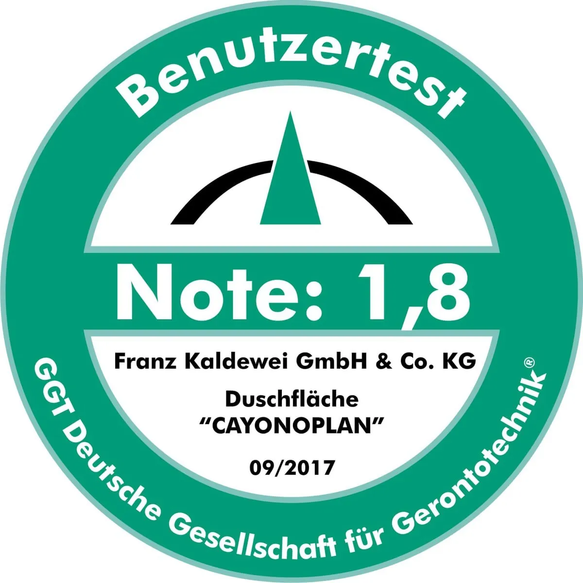 Die emaillierte Duschfläche Cayonoplan von Kaldewei hat das „GGT-Siegel“ der GGT Deutsche Gesellschaft für Gerontotechnik erhalten. Mit einer Gesamtnote von 1,8 wurde sie als „empfehlenswertes Produkt“ eingestuft und eignet sich damit nachweislich besonders für bewegungseingeschränkte Menschen.