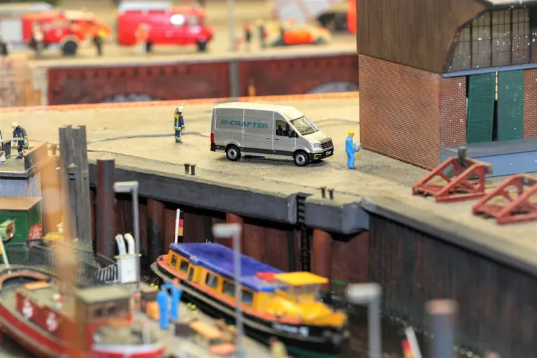 Der Miniatur e-Crafter (Maßstab 1:87) von Volkswagen Nutzfahrzeuge steht ab sofort am Museumshafen Hamburg in der größten Modelleisenbahnanlage der Welt. – © VW Nutzfahrzeuge