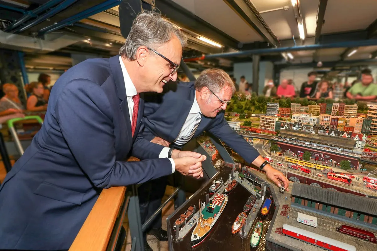 Andreas Rieckhof (links, Staatsrat der Behörde für Wirtschaft, Verkehr und Innovation, Hamburg) und Axel Anders (VWN-Entwicklungschef) stellen den winzigen e-Crafter (Maßstab 1:87) im Miniatur Wunderland an seinen Platz am Hamburger Museumshafen.