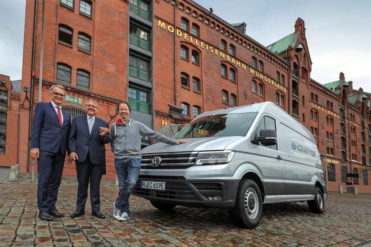 Axel Anders (VWN-Entwicklungschef) und Andreas Rieckhof (Staatsrat der Behörde für Wirtschaft, Verkehr und Innovation, Hamburg) waren vor Ort, um das neue Mitglied im Miniatur Wunderland Hamburg an seinen Platz am Museumshafen zu stellen. Anlass ist ein zweiwöchiger Praxistest des realen e-Crafter, der gestern in Hamburg startete.