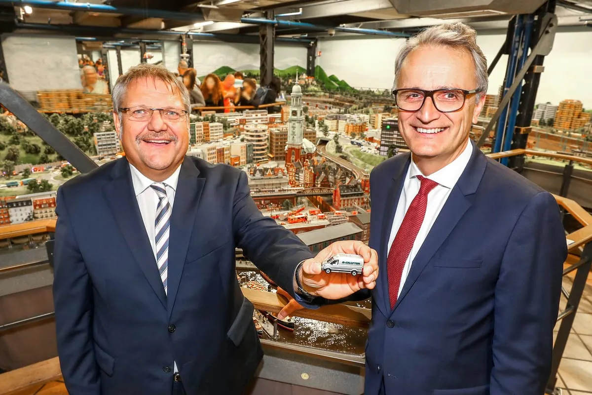 Axel Anders (links, Volkswagen Nutzfahrzeuge Entwicklungschef) und Andreas Rieckhof (Staatsrat der Behörde für Wirtschaft, Verkehr und Innovation, Hamburg) mit dem winzigen e-Crafter (Maßstab 1:87) im Miniatur Wunderland Hamburg.