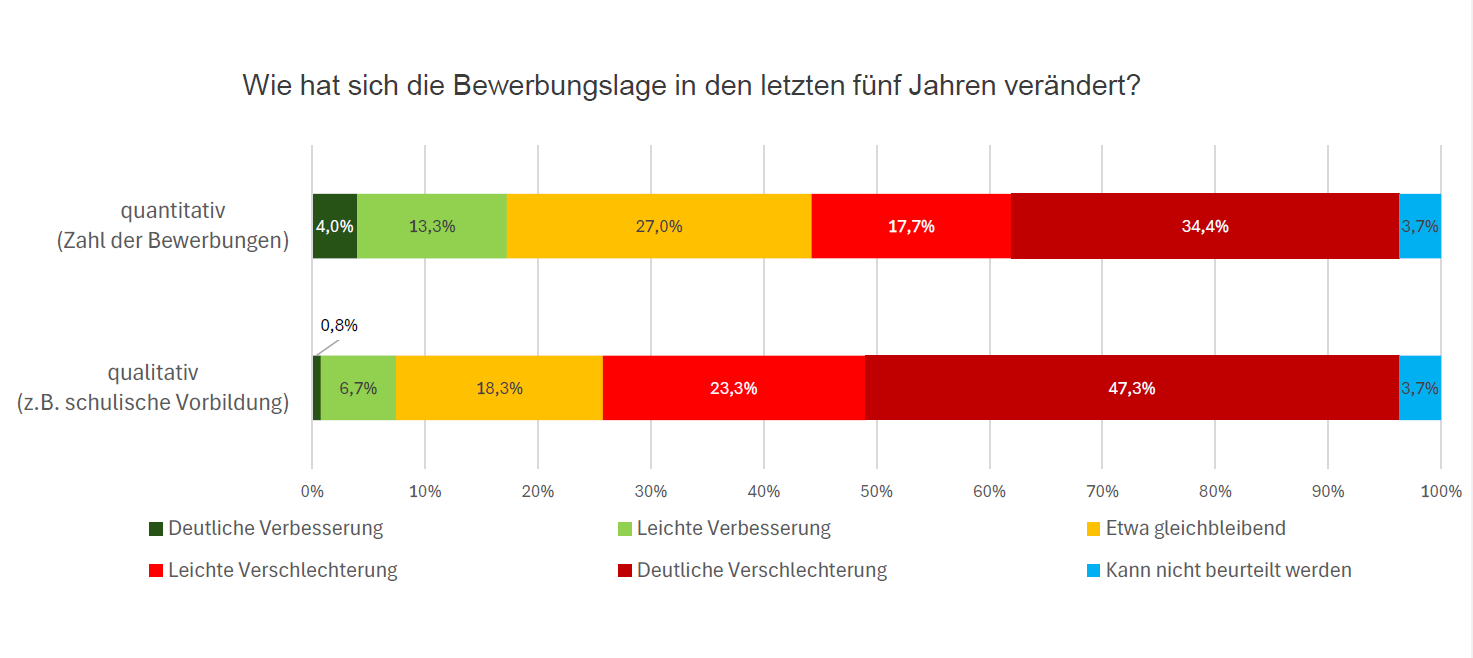 Parallel zum Rückgang der Bewerbungen vermelden die Umfrageteilnehmer, dass sich die Qualifikation der Bewerber in den letzten fünf Jahren verschlechtert habe. So gaben rund 70 Prozent der ausbildenden Betriebe an, die schulische Vorbildung der Bewerber habe in den vergangenen fünf Jahren abgenommen.