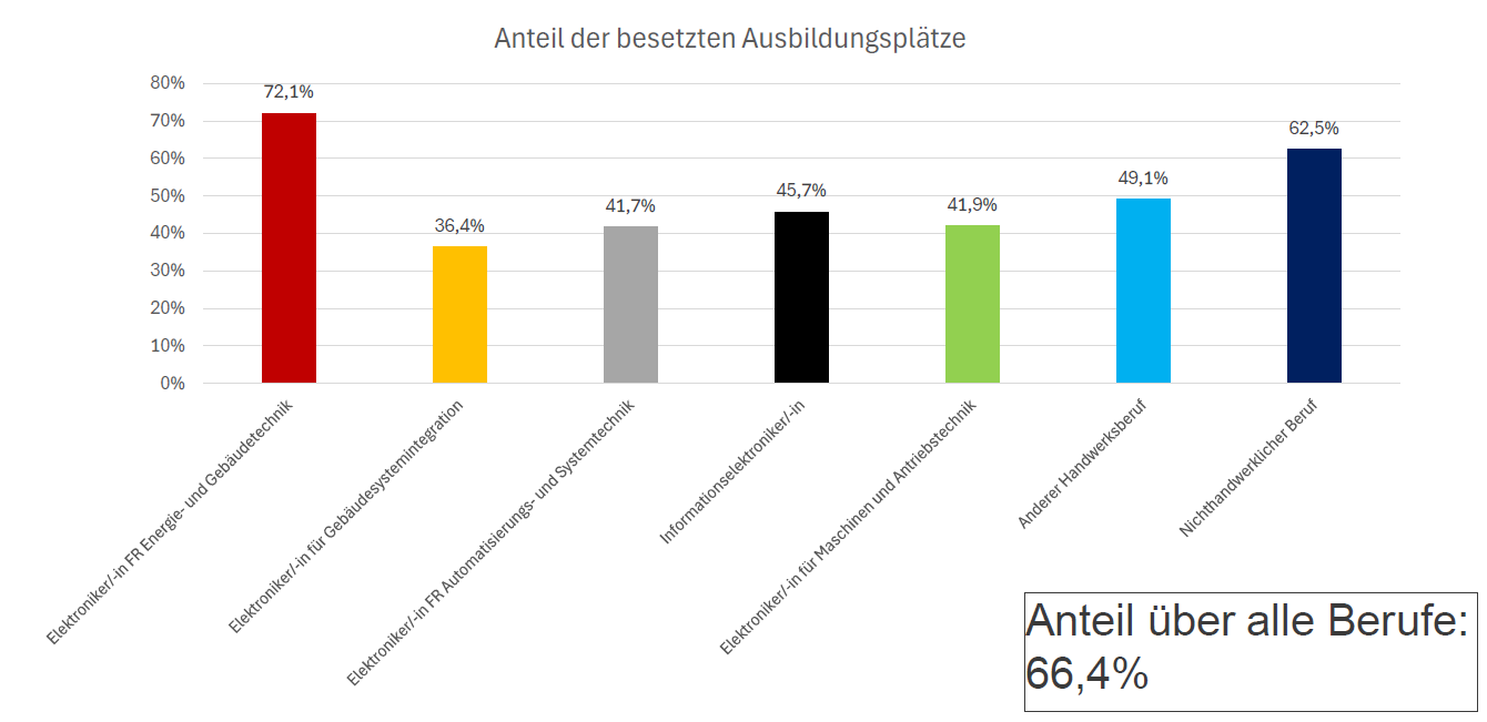 Als Grund für die niedrige Besetzungsrate nennt der ZVEH die schwierige Bewerberlage. So konkurrieren – trotz der Wirtschaftskrise – aufgrund der demografischen Entwicklung und des steigenden Fachkräftebedarfs viele Branchen um Ausbildungsinteressierte. Das schlägt sich auch auf die Bewerberzahl in den E-Handwerken nieder. So meldeten 52 Prozent der vom ZVEH befragten Betriebe einen Rückgang bei den Bewerbungen innerhalb der letzten fünf Jahre. Eine Verbesserung registrierten lediglich 17 Prozent.