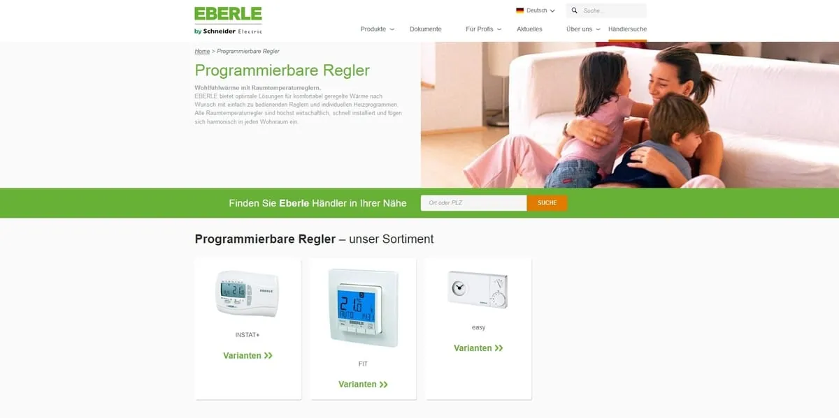 Unter dem Reiter „Produkte“ sind sämtliche Produktgruppen zu finden. Dazu gehören unter anderem smarte Thermostate, Funkregler, Mess- und Überwachungsrelais, Thermische Stellantriebe, Lösungen für Fußbodenheizungen oder programmierbare Raumtemperaturregler. Klickt man die jeweilige Kategorie an, erhält man eine Übersicht über die Produkte dieser Sparte – mit allen verfügbaren Varianten und Bildern. In den Unterkategorien finden Nutzer die jeweiligen Produktinformationen gebündelt auf einem Blick, ebenso die wichtigsten technischen Daten. Außerdem sind die verfügbaren Dokumentationen wie Bedienungsanleitungen, Datenblätter oder Broschüren direkt verlinkt. Unter jedem Produkt ist ein Suchfeld für die Fachhändlersuche zu finden.