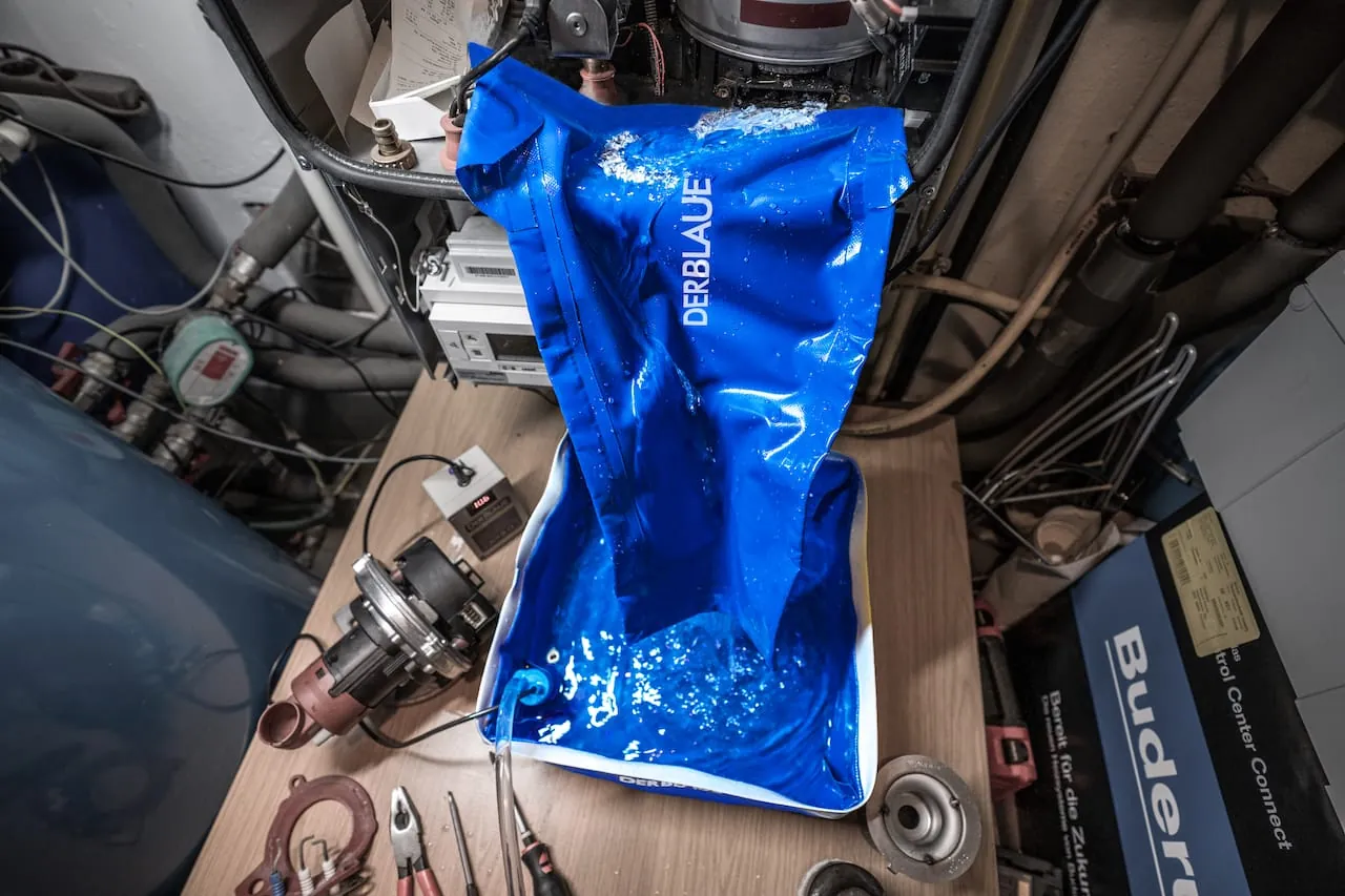 Bis zu 10 Liter Fassungsvermögen hat das Kernprodukt des Blauen und wurde aus einer sehr robusten, gewebeverstärkten Spezialplane gefertigt. Das Einzigartige sind die integrierten Biegemetallelemente, die sich beliebig oft formen lassen und dann in der jeweiligen Einbausituation formstabil stehen bleiben. So kann die Wanne in besonders engen, flachen, verwinkelten Situationen perfekt angepasst oder um Rohre gebogen werden. Zusätzlich sorgt eine obere, umlaufende Dichtlippe dafür, dass selbst Flüssigkeiten, die an der Wand herunterlaufen, in der Wanne aufgefangen werden. Sie ist ein universell einsetzbares Werkzeug, das den Alltag wesentlich erleichtert. Und weil sie zudem nur 580 Gramm wiegt und auf ein kleines Packmaß zusammengefaltet werden kann, passt sie in jeden Werkzeugkoffer.
