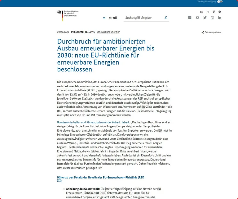 Europäische Kommission, Europäisches Parlament und Europäischer Rat haben sich in einem informellen Trilog auf eine umfassende Neugestaltung der EU-Erneuerbaren-Richtlinie (RED III) geeinigt. – © Screenshot www.bmwk.de (Stand 30.03.2023)