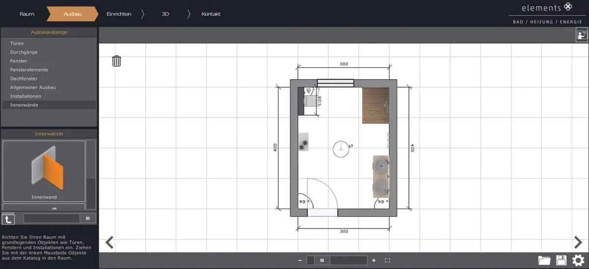 Im Webportal legt der Nutzer zunächst die Raummaße sowie die Position der Fenster und Türen fest, dann folgen die einzelnen Produkte. Die einzelnen Badprodukte lassen sich bequem per Drag and Drop einfügen.