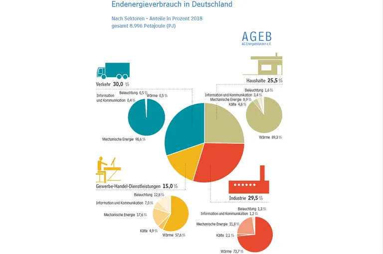 Mehr als 53 % des gesamten Endenergieverbrauchs entfällt in Deutschland auf die Bereitstellung von Wärme. Einem Rückgang beim Raumwärmebedarf standen Zuwächse beim Bedarf von Prozesswärme in Industrie und Gewerbe gegenüber. Die vorliegenden Daten lassen erkennen, dass in beiden Bereichen die Energieeffizienz deutlich angestiegen ist, bei der Verwendung von Prozesswärme die positive Wirtschaftsentwicklung der zurückliegenden Jahre jedoch zu einer Überkompensierung der Energieeinsparerfolge geführt hat. Mit knapp 39 % bildet die motorische Energie den zweitgrößten Anteil am Endenergieverbrauch. Auf Warmwasser, Kälte, Beleuchtung sowie Informations- und Kommunikationstechnik entfielen 2018 zusammen lediglich knapp 13 % des gesamten Endenergieverbrauchs.