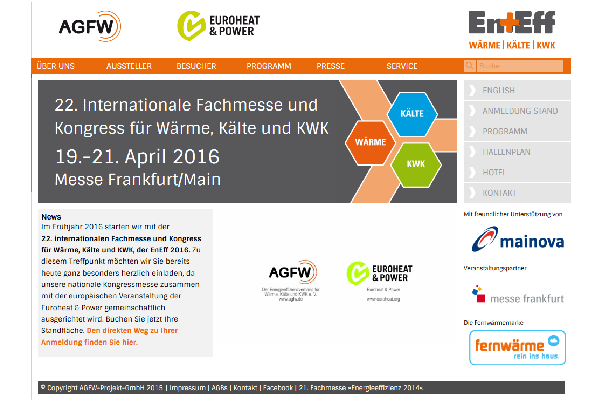 Vom 19. bis 21. April 2016 findet die 22. EnEff, Internationale Fachmesse und Kongress für Wärme, Kälte und KWK, in der Halle 4 auf dem Frankfurter Messegelände statt.