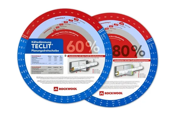 Die „Rockwool Teclit Drehscheibe“ wurde entwickelt, um die Ermittlung optimaler Dämmdicken und die Auswahl der entsprechenden Rohrschalen aus dem „Teclit“ System zu erleichtern. Im Zuge der Berechnungen hatte sich zugleich gezeigt, dass alle berechneten Anwendungsfälle einer von zwei Dämmstärkenreihen zugeordnet werden können. „Die Drehscheibe zeigt deshalb jetzt an, ob eine Dämmung mit der Systemvariante ‚Teclit 60 %‘ oder der Variante ‚Teclit 80 %‘ zu optimalen Ergebnissen führt“, erklärt Martin Schwark, Manager Segment Cold Piping bei der Deutschen Rockwool. „Eine der beiden Varianten wird in der Regel für eine energetisch optimierte Dämmung sorgen und zugleich den Ausfall von Tauwasser vermeiden. Die sachgerechte Berechnung und Ausführung der Dämmung wird damit deutlich erleichtert.“