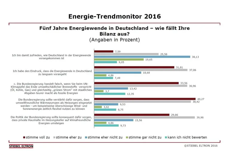 Der „Energie-Trendmonitor 2016“ von Stiebel Eltron gibt Auskunft darüber, wie die Deutschen zu den Zielen und Konsequenzen der Energiewende stehen. Dafür wurden im Mai 2016 in vierter Auflage 1.000 Bundesbürger über ein Marktfortschungsinstitut bevölkerungsrepräsentativ befragt.