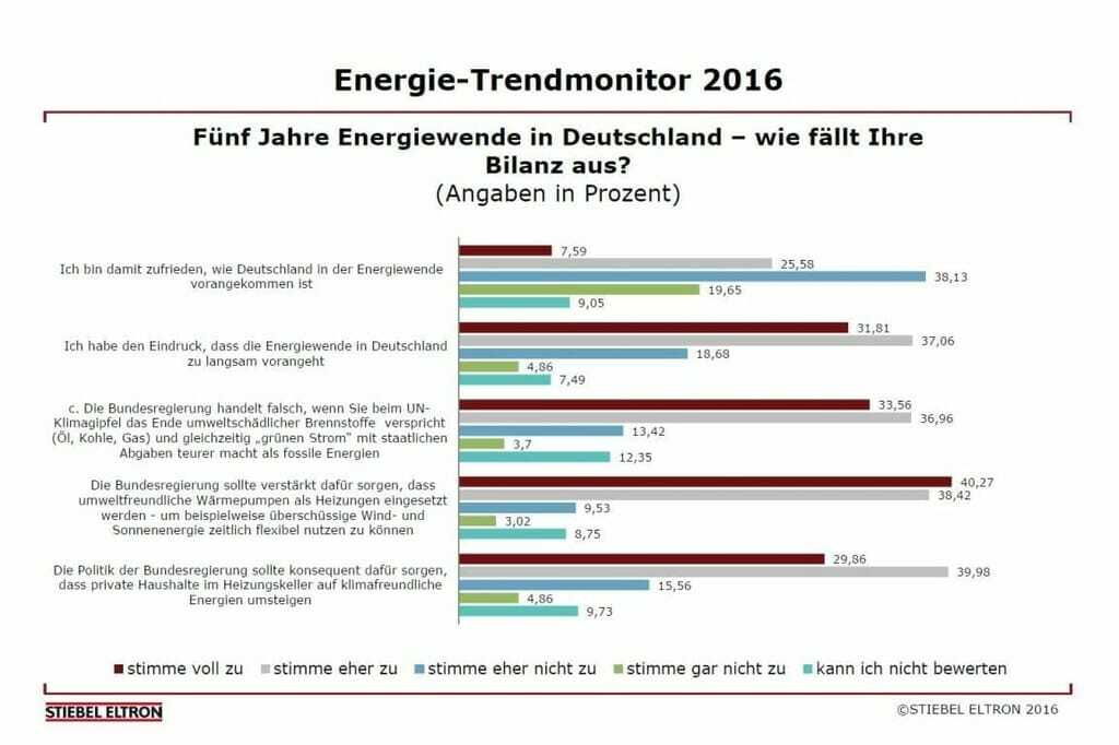 Der „Energie-Trendmonitor 2016“ von Stiebel Eltron gibt Auskunft darüber, wie die Deutschen zu den Zielen und Konsequenzen der Energiewende stehen. Dafür wurden im Mai 2016 in vierter Auflage 1.000 Bundesbürger über ein Marktfortschungsinstitut bevölkerungsrepräsentativ befragt.