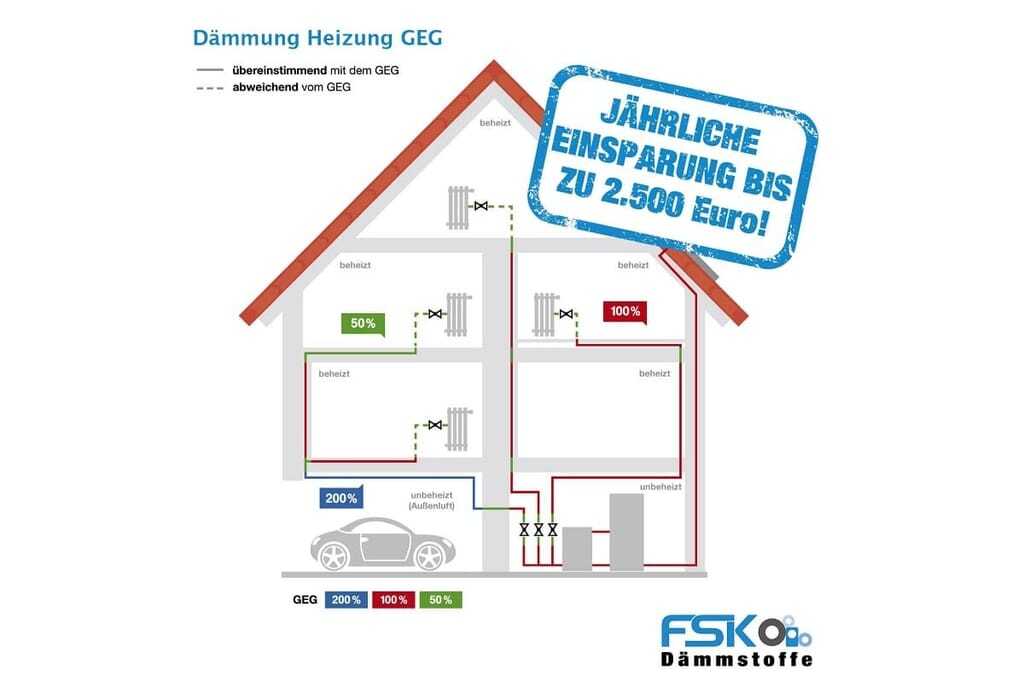 In einem Zweifamilienhaus können Sie allein durch das Dämmen ungedämmter Heizungsrohre bereits über 2.500 Euro pro Jahr an Energiekosten sparen, wenn wir von einem Rohrleitungsnetz mit ca. 220 m und einem Ölpreis von 1,20 Euro pro Liter ausgehen. Wenn Sie nur die freiliegenden Leitungen korrekt dämmen, haben Sie ebenfalls ein enormes Einsparpotential. So auch bei einer Wohnung mit ca. 80 m Rohrleitungen. Bei einem Ölpreis von 1,20 Euro pro Liter bedeutet das eine Einsparung von ca. 900 Euro im Jahr. Ausreichend Material für alle Rohre erhalten Sie als Do-it-Yourself-Heimwerker schon zwischen 100 Euro (80 m) und 500 Euro (220 m). Die Investitionskosten für die Dämmung haben sich bei dieser Betrachtung innerhalb von einem Jahr bereits amortisiert. In jedem Fall können Sie von einer Heizenergieeinsparung von 9,5 Liter Heizöl pro gedämmten laufenden Meter Rohr im Jahr gegenüber einem nicht isolierten Rohr rechnen!