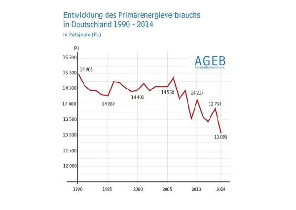 Der Energieverbrauch in Deutschland lag 2014 nach ersten Berechnungen bei rund 13 100 Petajoule (PJ) beziehungsweise 446,5 Millionen Tonnen Steinkohleneinheiten (Mio. t SKE). Das waren 4,8 Prozent weniger als im Vorjahr.