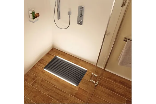Vor der Dusche und vor dem Waschtisch dient die anschlussfreie ACO Walk-in als Auffangbecken für Spritzwasser, das einfach verdunstet. Den passenden Holzrost gibt es aus hellem Teak- und dunklem Lapachoholz. Beide Farbtöne verleihen dem Badezimmer eine sehr wohnliche und behagliche Atmosphäre. Die spezielle Oberflächenbeschichtung versiegelt die Hölzer und schützt sie nachhaltig vor Wasser, Seife und Shampoo.