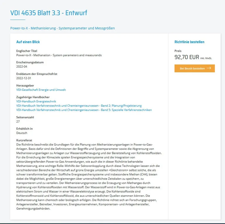 Herausgeber der Richtlinie VDI 4653 Blatt 3.3 „Power-to-X – Methanisierung – Systemparameter und Messgrößen“ ist die VDI-Gesellschaft Energie und Umwelt (GEU). Der Richtlinienentwurf kann zum Preis von 92,70 Euro unter www.beuth.de bestellt werden. VDI-Mitglieder erhalten 10 % Preisvorteil auf alle VDI-Richtlinien.