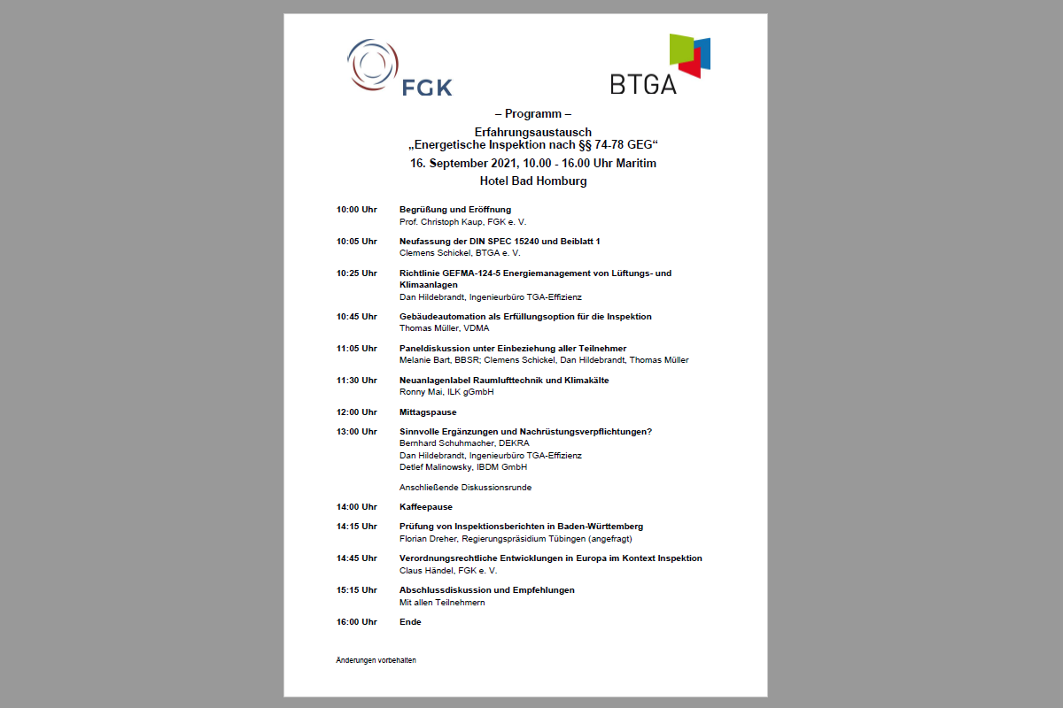 Mehr als 1.100 Experten haben mittlerweile an den Schulungen zur Energetischen Inspektion von Klimaanlagen nach § 12 Energieeinsparverordnung (EnEV) bzw. § 74-78 Gebäudeenergiegesetz (GEG) teilgenommen, die der Fachverband Gebäude-Klima e. V., FGK, gemeinsam mit dem Bundesindustrieverband Technische Gebäudeausrüstung e. V., BTGA, veranstaltet hat. Nun bieten BTGA und FGK erneut einen Rahmen für den gezielten Austausch von Praxiserfahrungen: Gemeinsam mit Experten aus dem Bereich der Energetischen Inspektion soll am 16. September 2021 im Maritim Hotel Bad Homburg die aktuelle Situation aus unterschiedlichen Blickwinkeln beleuchtet und diskutiert werden.