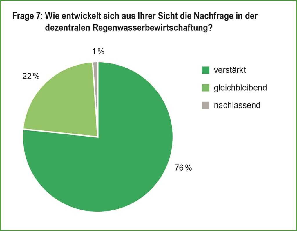 Die Ergebnisse zeigen eindrucksvoll, dass das Umdenken in der Branche voranschreitet. So sehen 77 % der Befragten die dezentrale Regenwasserbewirtschaftung positiv. Sie bestätigen so den seit zwei Jahrzehnten stattfindenden Paradigmenwechsel im Umgang mit Regenwasser. Mit 99 % erwarten fast alle Teilnehmer der Umfrage auch eine steigende oder zumindest gleichbleibende Nachfrage bei den Maßnahmen der dezentralen Regenwasserbewirtschaftung. Unter dem Eindruck länger werdender Trockenphasen und heftigerer Starkregenereignisse ist die Regenwassernutzung zum Topthema der Zukunft geworden, dicht gefolgt vom Thema Starkregen.