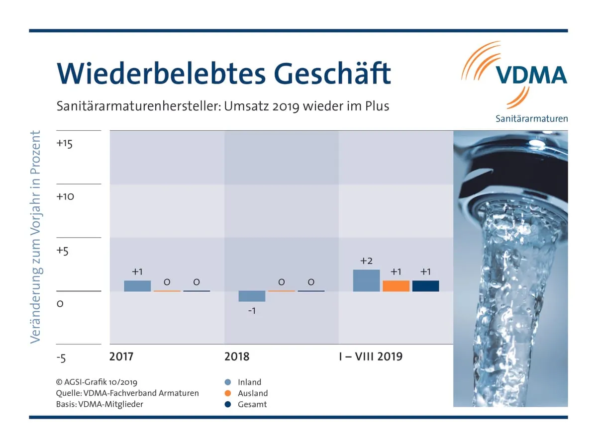 Nach zwei schwachen Vorjahren mit stagnierenden Umsätzen zeichne sich für die deutschen Hersteller von Sanitärarmaturen für 2019 erstmals wieder ein leichtes Umsatzplus ab, erklärte Wolfgang Burchard, Geschäftsführer der Arbeitsgemeinschaft Sanitärarmaturenindustrie. Weiter führte er aus: „Im Inland legte der Umsatz im Zeitraum Januar bis August um 2 % zu. Das Auslandsgeschäft wuchs um 1 %, so dass insgesamt ein Umsatzplus von einem Prozent erzielt wurde.“