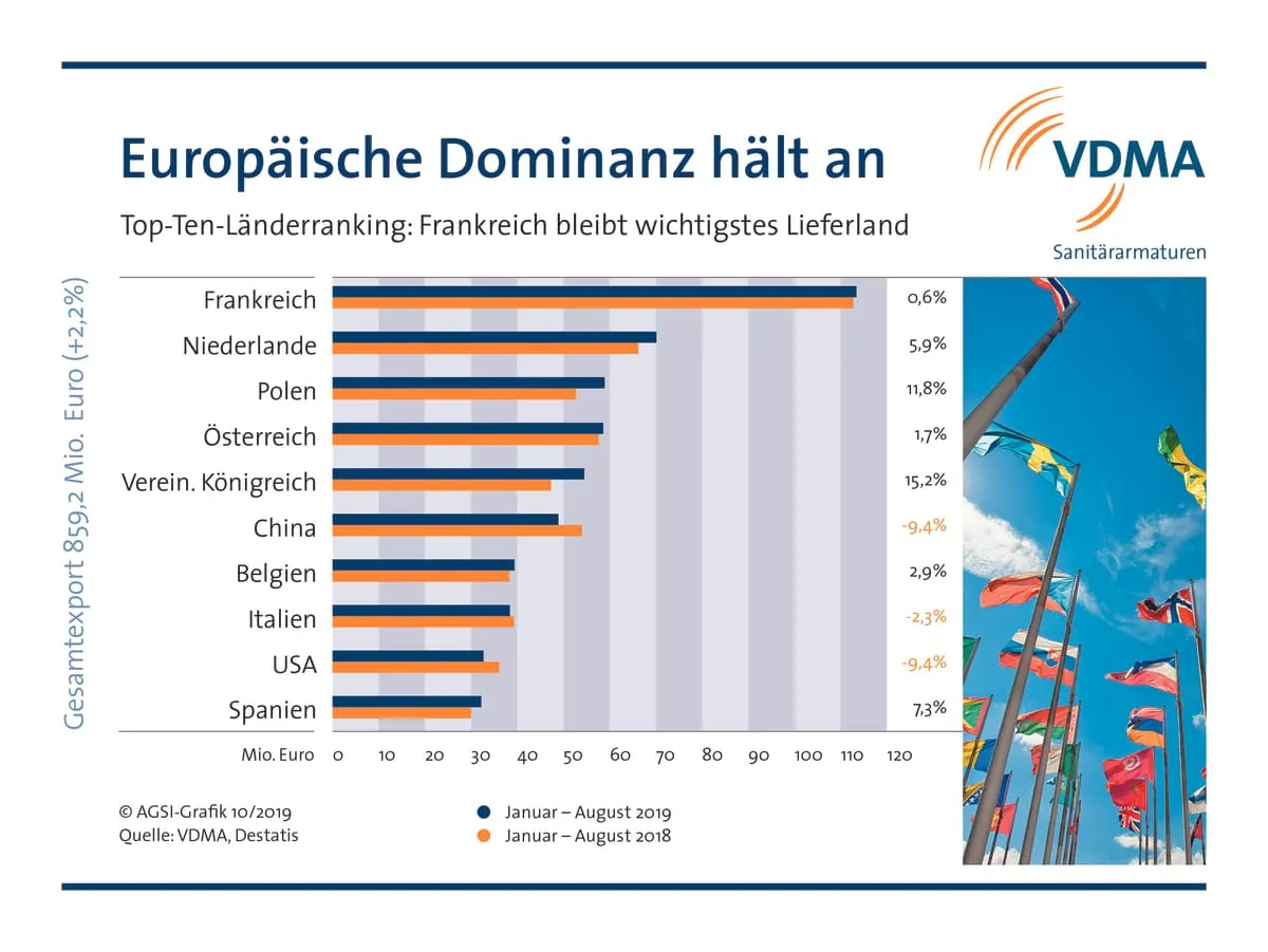 Trotz der international insgesamt eher schwächelnden Konjunktur befinde sich der Export in zahlreichen europäischen Nachbarländern auf Expansionskurs, zog Burchard Bilanz. Dies liege beispielsweise an der florierenden Bauwirtschaft in den Niederlanden und Belgien. In Polen boome neben dem Wohnungsbau neuerdings auch der Bau hochwertiger Hotels, was zu einer erhöhten Nachfrage deutscher Sanitärarmaturen beitrage. So stieg der Export in den ersten acht Monaten dieses Jahres um 2,2 % auf insgesamt 859 Mio. Euro. Wie in den Vorjahren wurde dabei die Liste der Top 10 Absatzländer von Frankreich angeführt: Die Lieferungen in das Nachbarland legten um 0,6 % auf 113,4 Millionen zu. Mit großem Abstand folgten auf Rang zwei die Niederlande mit einem Plus von 5,9 % auf 70,1 Millionen Euro.
