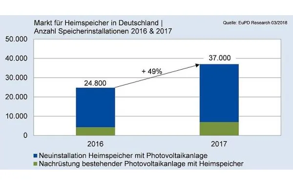 Laut einer aktuellen Analyse von EuPD Research wurden 2017 bundesweit etwa 37.000 Heimspeicher in Deutschland installiert. Die Nachfrage im Vergleich zum Vorjahr ist damit um 49 % angewachsen.