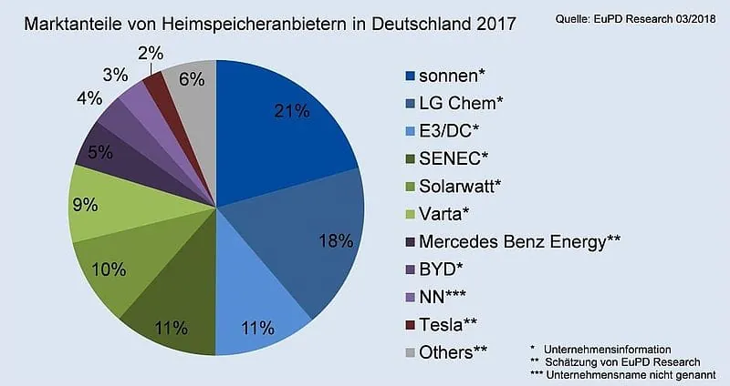 Auf der Seite der Anbieter von Heimspeicherlösungen konnte sich laut EuPD Research das in Bayern ansässige Unternehmen sonnen abermals als stärkster Anbieter in Deutschland behaupten. Unter den Top 7 Anbietern findet sich mit LG Chem auf Platz 2 das einzige Unternehmen mit Sitz außerhalb von Deutschland. Gefolgt wird das Führungsduo von E3/DC, Deutsche Energieversorgung (SENEC), Solarwatt und Varta mit Marktanteilen zwischen 9 und 11 %. Die Analyse der Marktanteile lässt nach Angaben des Marktforschungsinstituts erkennen, dass trotz einer Anzahl von über 50 Anbietern von Heimspeicherlösungen im deutschen Markt, der größte Anteil bei den Top-Unternehmen liegt. Entsprechend decken die drei größten Anbieter sonnen, LG Chem und E3/DC bereits die Hälfte des deutschen Marktes ab.