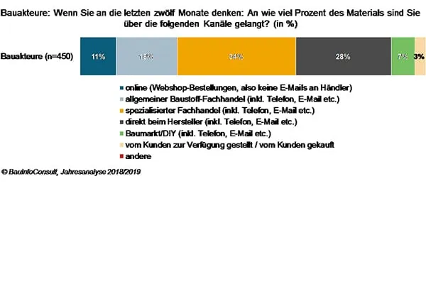 Verarbeiter kaufen ihr Material bevorzugt beim Fachhändler – egal ob beim allgemeinen Baustofffachhandel oder spezialisierten Fachhandel. Das belegen Vorabergebnisse der BauInfoConsult Jahresanalyse 2018/2019. Allerdings wird der Direktvertrieb der Hersteller zunehmend zur Konkurrenz für die alteingesessenen Händler.