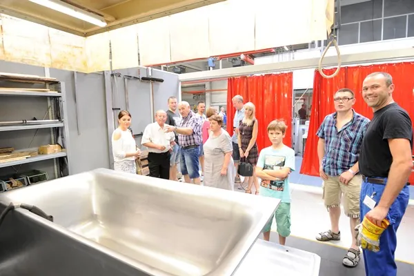 Der Tag der offenen Tür ist für die Mitarbeiter eine willkommene Gelegenheit, um ihren Familien einen Einblick in die tägliche Arbeit zu ermöglichen. So konnten die Angehörigen einen Blick hinter die Kulissen des Unternehmens werfen, denn die Produktion lief in allen Bereichen und machte die Entstehung der Badobjekte für die Besucher unmittelbar erlebbar. Auch für die ehemaligen Mitarbeiter war interessant zu sehen, dass Bette weiter in den Standort Delbrück investiert und wie sich das familiengeführte Unternehmen in den letzten Jahren verändert hat: Die gesamte Produktion konnte besichtigt werden. Unter anderem eine frisch umgebaute Manufaktur, das 2014 errichtete Emaillierwerk und das neue Verwaltungsgebäude.