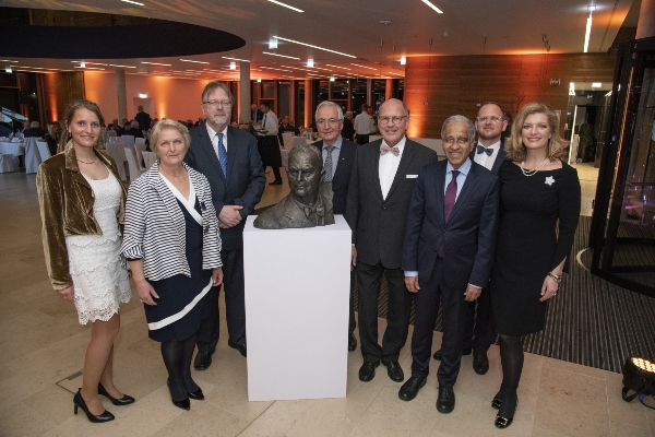 Festakt in Holzminden zum 125. Geburtstag des Firmengründers (v.l.n.r.): Andrea Stiebel, Inge Stiebel, Frank Stiebel, Laudator Prof. Dr. Klaus Töpfer, Dr. Ulrich Stiebel, Festredner Prof. Dr. Mojib Latif, Kai Stiebel und Moderatorin Sabine Stamm gruppiert um die Büste von Dr. Theodor Stiebel. – © Stiebel Eltron