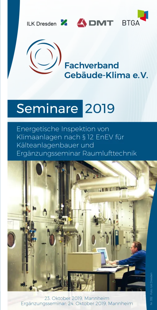 Der Fachverband Gebäude-Klima e. V. (FGK) setzt seine erfolgreiche Seminarreihe für das Kälteanlagenbauerhandwerk mit dem Titel „Energetische Inspektion von Klimaanlagen nach § 12 EnEV für Kälteanlagenbauer und Ergänzungstag Raumlufttechnik“ fort.