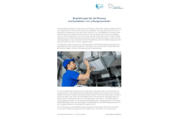 Der Fachverband Gebäude-Klima e. V. (FGK) hat Empfehlungen für Lüftungssysteme zusammengefasst und dazu die Publikation „Empfehlungen für die Planung und Installation von Lüftungssystemen“ veröffentlicht.