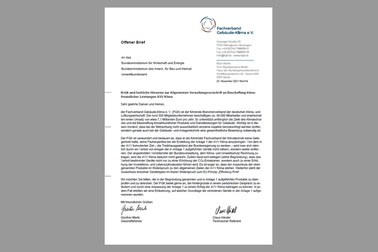Grundsätzlich begrüßt der FGK die AVV Klima und das darin formulierte Ziel, die Treibhausgasemissionen der Bundesregierung zu verringern. Einige der in Anlage 1 der Vorschrift aufgeführten Beschränkungen sind jedoch kontraproduktiv, da das Verbot bestimmter Geräte zu höheren CO2-Emissionen und zu höheren Investitions- und Lebenszykluskosten (LCC) führt. Einzelne Gerätetypen von der Beschaffung auszuschließen, steht darüber hinaus im Widerspruch zum EU-Prinzip „Efficiency First“. Der FGK hat sich mit einem offenen Brief an verschiedene Bundesministerien und an das Umweltbundesamt gewandt, um zu erreichen, dass die in Anlage 1 der AVV Klima aufgeführten und für die Beschaffung verbotenen Multisplit-/VRF-Klimageräte, Flüssigkeitskühler sowie Geräte mit halogenierten Kältemitteln gestrichen werden.