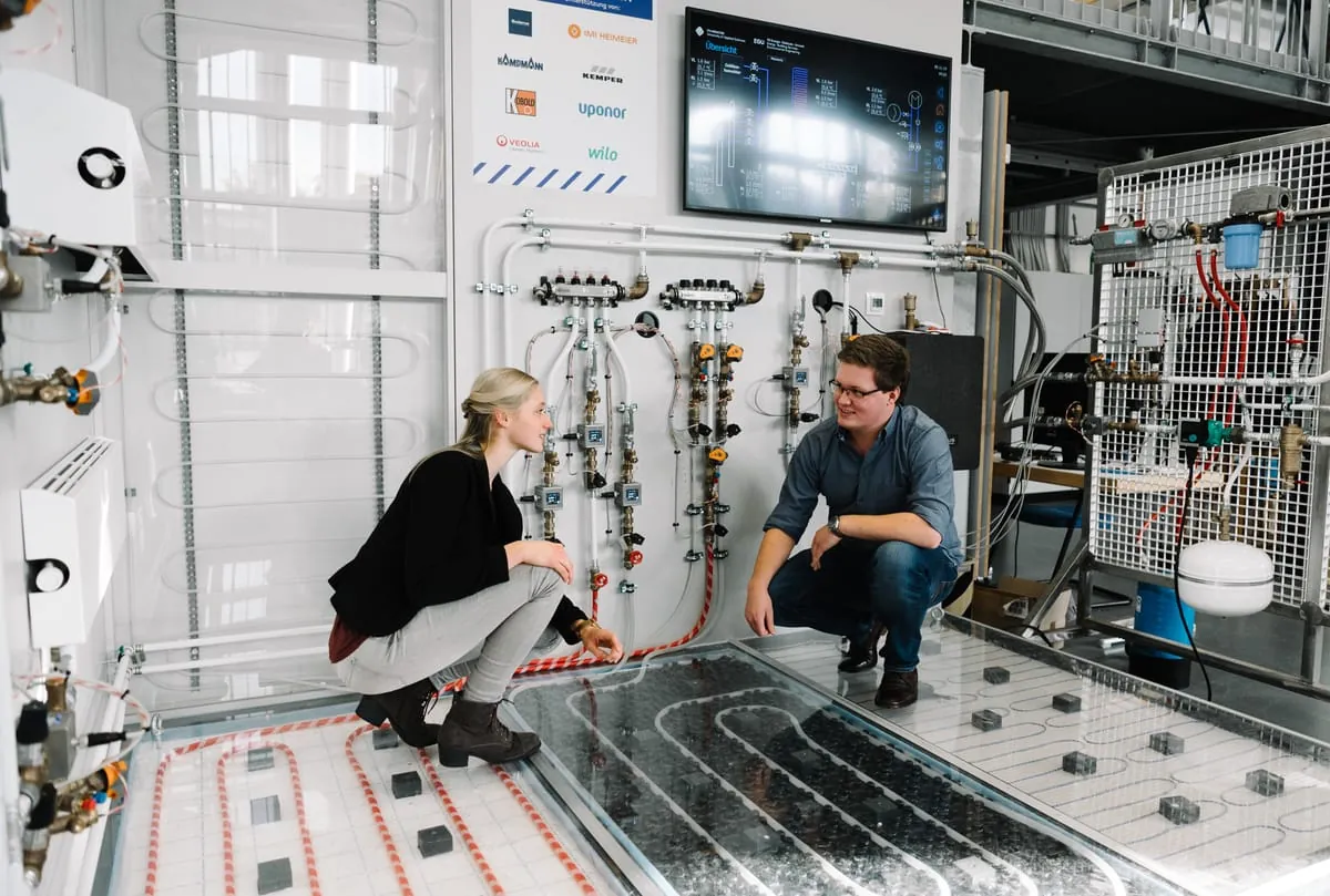 Genau diese wichtigen Berechnungen können die Studierenden in dem neuen Modellraum jetzt lernen und praktisch umsetzen. „Die Idee zum Versuchsraum habe ich bereits vor einigen Jahren entwickelt. Denn zum hydraulischen Abgleich gab es an unserem Fachbereich keinerlei praktische Versuche, obwohl das Thema so wichtig ist. Ich bin froh, dass wir den Studierenden das jetzt praxisnah und in unterschiedlichen Facetten näherbringen können“, sagt Martin Tiemann, wissenschaftlicher Mitarbeiter in der Heizungstechnik. Dafür stehen nicht nur konventionelle Heizungskörper zur Verfügung, sondern auch Fußboden- und Wandheizungen sowie Heizungsgebläse und die Frischwasserstation.