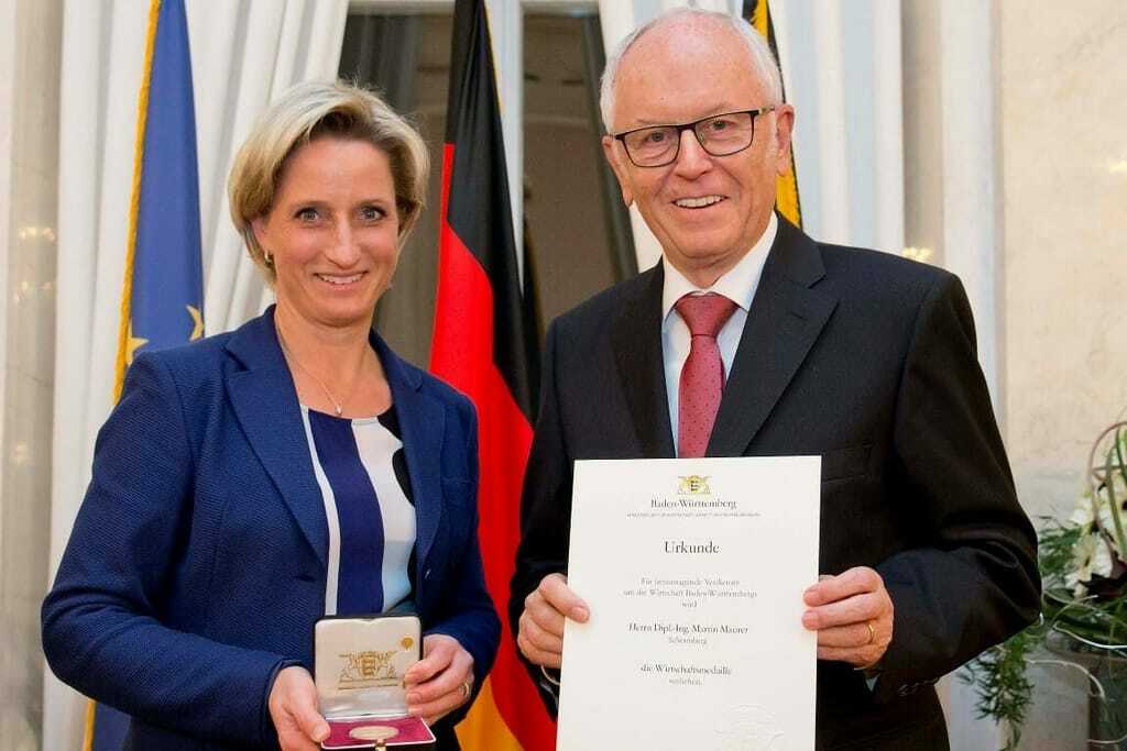 Der ehemalige geschäftsführender Gesellschafter der Firmengruppe Maurer hat für seine unternehmerische Leistung die Wirtschaftsmedaille des Landes Baden-Württemberg erhalten. Sie wird seit 1987 an Persönlichkeiten verliehen, die sich in herausragender Weise um die Wirtschaft verdient gemacht haben.