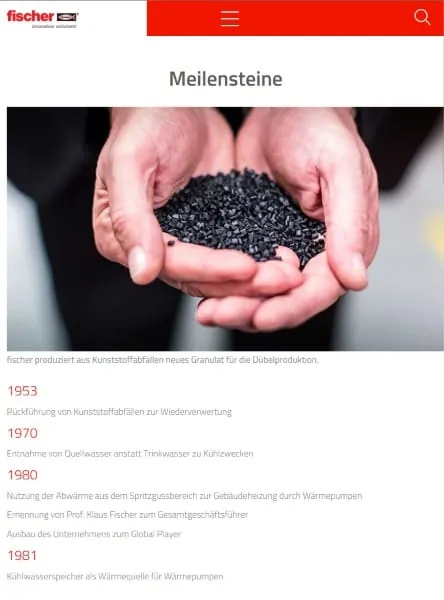 Das neue Fischer Unternehmensportal enthält Informationen zur gesamten Unternehmensgruppe mit ihren vier Unternehmensbereichen Fischer Befestigungssysteme, Fischer Automotive Systems, Fischertechnik und Fischer Consulting. Interessierte finden hier ausführliche Details zur Philosophie des Unternehmens und zum Thema Nachhaltigkeitsmanagement. Bewerber finden auf der neu gestalteten Karriereseite umfassende Informationen und Tipps zur Bewerbung, zur Ausbildung und zur Arbeit bei Fischer.