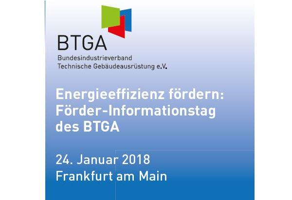 Der BTGA – Bundesindustrieverband Technische Gebäudeausrüstung veranstaltet am 24. Januar 2018 in Frankfurt am Main einen Förder-Informationstag, um über die vielfältigen staatlichen Förderprogramme für den Bereich der Nichtwohngebäude zu informieren.