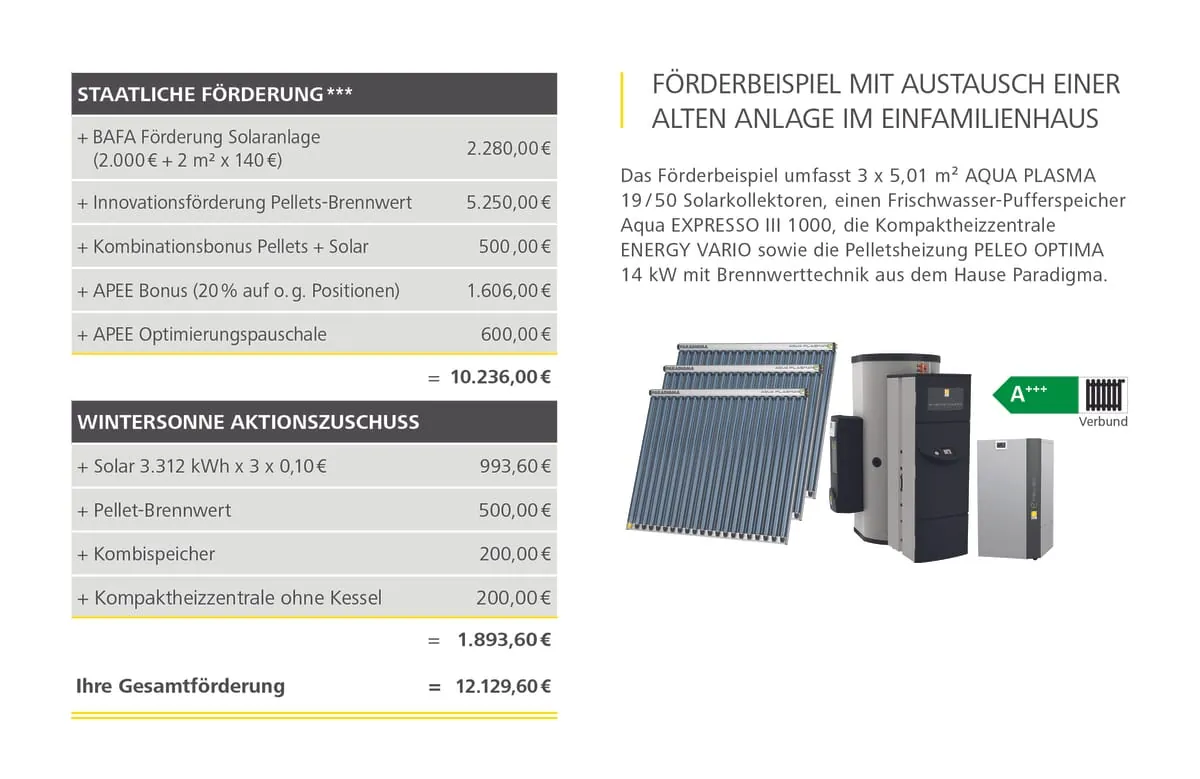 Mit ihrer Förderaktion „Wintersonne“ bezuschusst Paradigma noch bis zum 31. März 2018 den Kauf eines eigenen Solarthermie-Kollektors, Wärmespeichers, Pelletskessel, eines Pellets-Brennwertkessels sowie eines Gas-Brennwertgerätes.