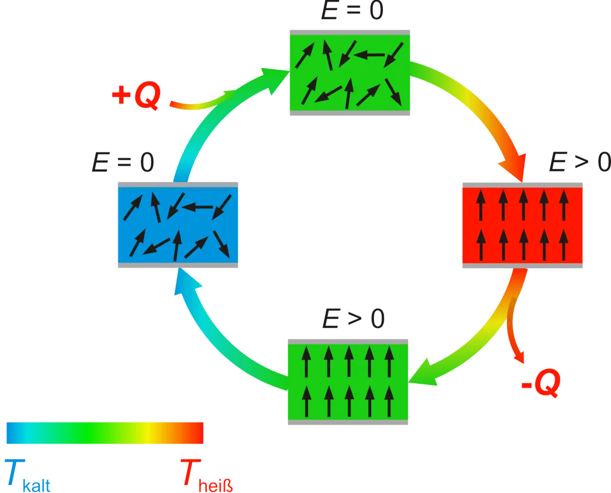 Legt man ein elektrisches Feld an elektrokalorische Materialien an, so richten sich die elektrischen Dipolmomente im Feld aus – diese zusätzliche Ordnung geht nach Gesetzen der Thermodynamik einher mit einer Erwärmung des Materials. Die entstehende Wärme wird über eine Wärmesenke abgeführt, sodass das Material wieder auf die Ausgangstemperatur abkühlt. Wird nun das elektrische Feld entfernt, so verringert sich die Ordnung und das Material kühlt – ebenfalls den Gesetzen der Thermodynamik folgend – ab. Jetzt kann es thermische Energie aus einer Wärmequelle aufnehmen. Der Effekt ist reversibel. So kann ein Zyklus aufgebaut werden, der als effiziente Wärmepumpe zum Kühlen oder Heizen funktioniert.