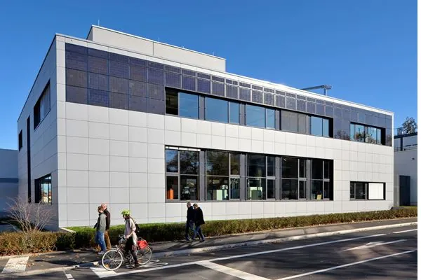 Ein Laborgebäude des Fraunhofer-Instituts für Solar Energiesysteme (ISE) mit Photovoltaikfassade: Die bundesweit installierten Photovoltaikanlagen produzierten im Juli 2018 nach Angaben des Fraunhofer ISE 6,7 TWh Solarstrom und stellten damit einen neuen Allzeitrekord auf. – © Fraunhofer ISE