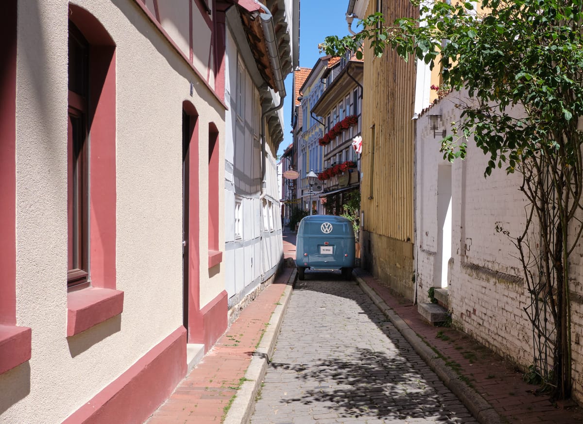 In der nur 63 m langen und sehr schmalen Straße „Am Kehrwieder“ wird die zierliche Figur von Sofie deutlich.