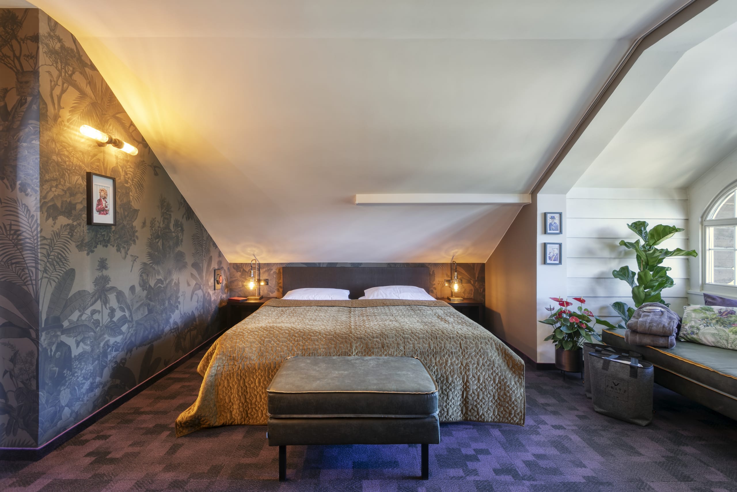© Fritz Lauterbad for Axor / Hansgrohe SEHotel Fritz, Lauterbad. Appartement47 by monkey47 Gin Nicht, dass der Blick in den Schwarzwald dem Gast schon genug Natur nahebringt – die Tapete mit Farnen, Blättern, Tiermotiven und vor allem Affenfiguren in verschiedenen Outfits sorgt für eine lebendige „grüne“ Stimmung mit Hommage an den Namensgeber, dem monkey47 Gin. -