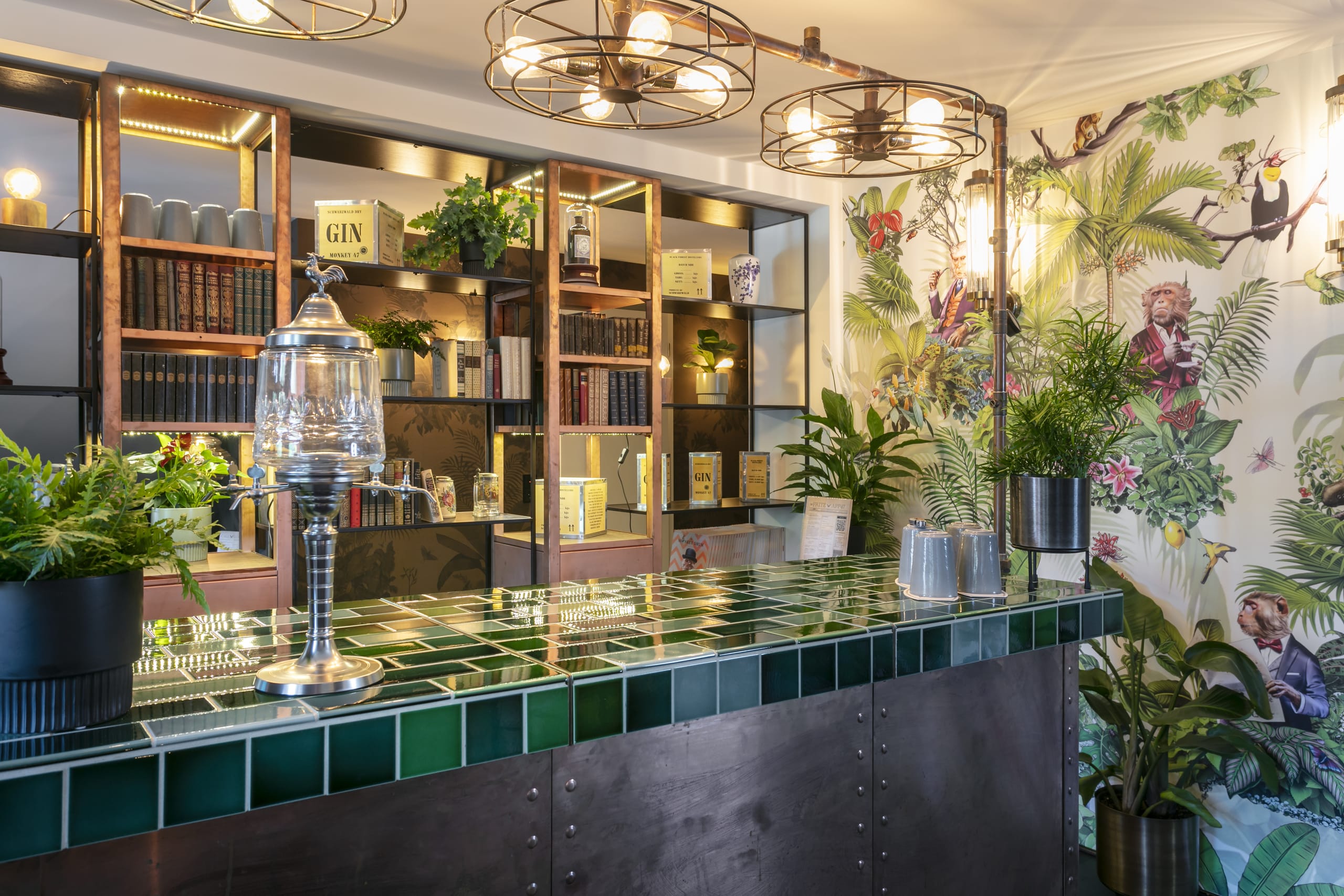 © Fritz Lauterbad for Axor / Hansgrohe SEHotel Fritz, Lauterbad. Appartement47 by monkey47 Gin Nicht, dass der Blick in den Schwarzwald dem Gast schon genug Natur nahebringt – die Tapete mit Farnen, Blättern, Tiermotiven und vor allem Affenfiguren in verschiedenen Outfits sorgt für eine lebendige „grüne“ Stimmung mit Hommage an den Namensgeber, dem monkey47 Gin. Der berühmte Wacholder-Schnaps aus dem Schwarzwald wird auch über die „Kupfer Bar“ im Zentrum der Suite thematisiert, die natürlich gut gefüllt ist und nach Belieben erweitert werden kann. -