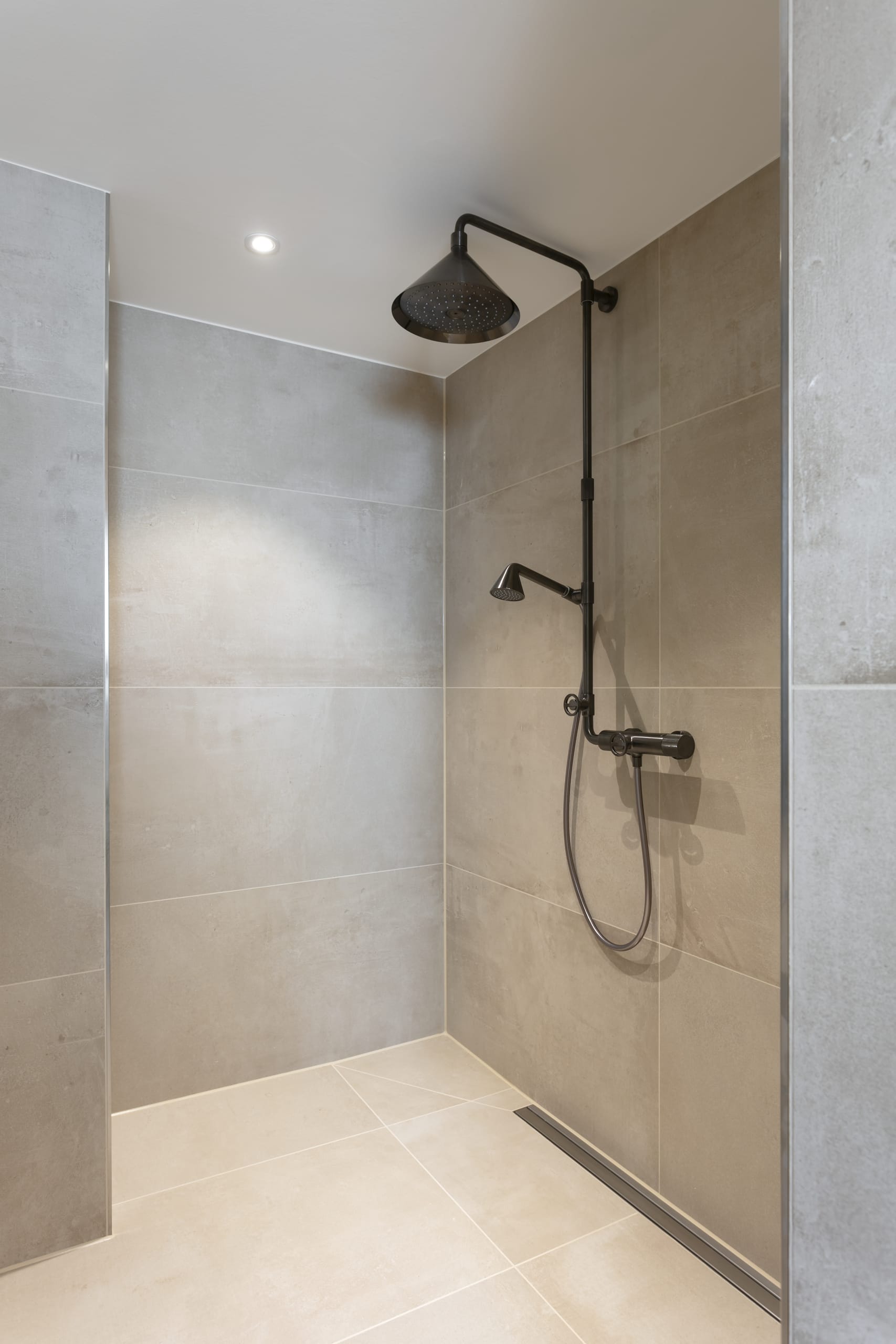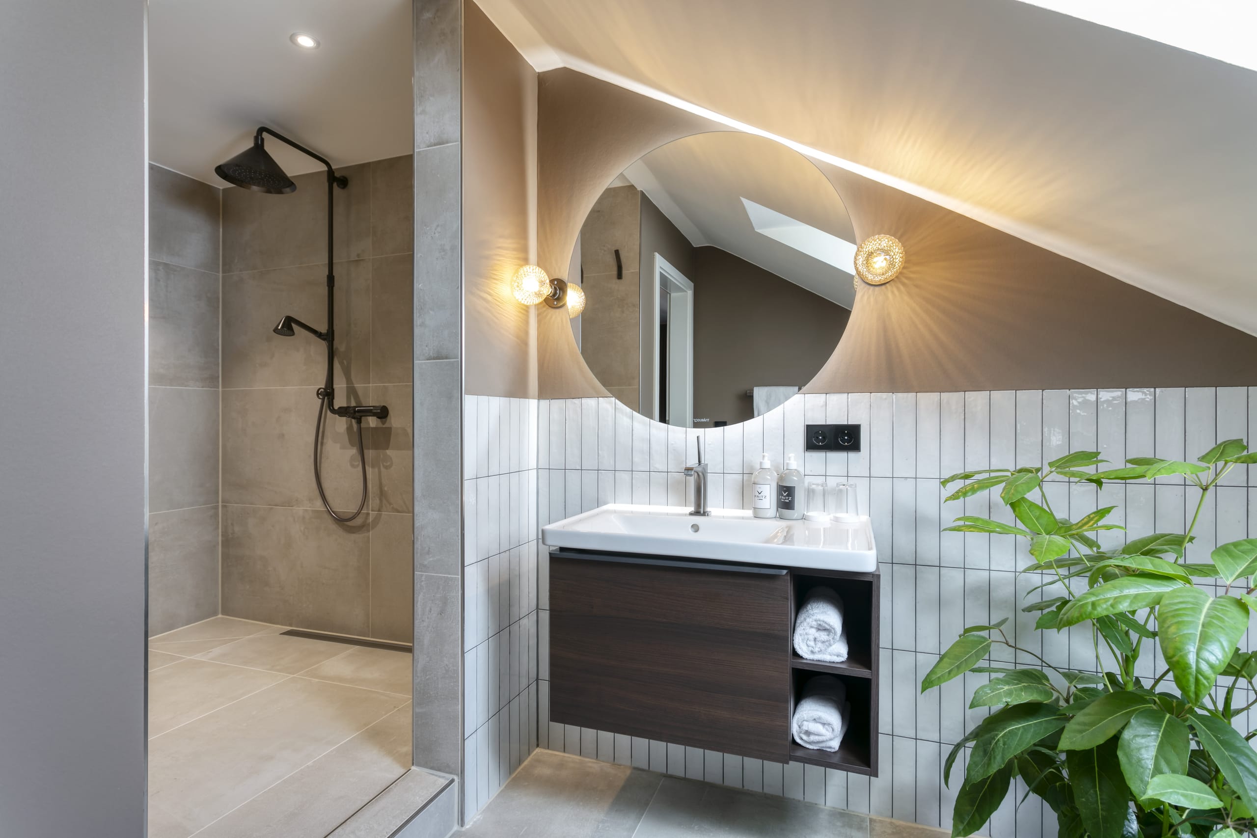 © Fritz Lauterbad for Axor / Hansgrohe SEHotel Fritz, Lauterbad. Appartement47 by monkey47 Gin Im großzügigen Badezimmer findet der Gast ein gediegenes, farblich ruhig gehaltenes Ambiente, das von hellgrauen Fliesen in Betonoptik, einem weiß-glänzenden Fliesenspiegel und einem Waschtischunterschrank in dunklem Holz getragen wird. Über ihm verleiht ein imposanter, runder Spiegel dem Raum mit Dachschräge und großem Fenster zusätzliche Weite. Die Einhebel-Waschtischarmatur der Kollektion AXOR Citterio E bringt mit seinen ausgewogenen Proportionen eine zeitlose Eleganz ins Bad und komplettiert in der Sonderoberfläche Brushed Black Chrome die warme Atmosphäre des Raums. -