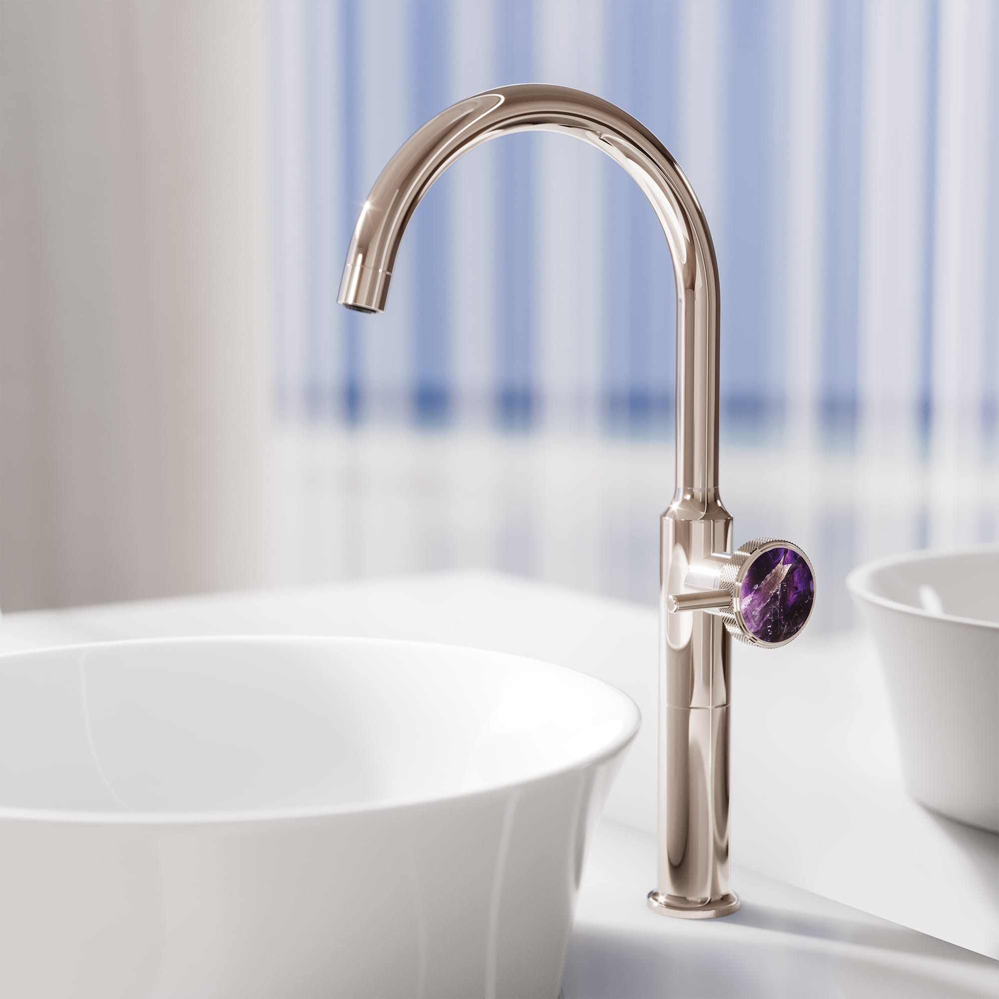 Eleganz und luxuriöse Anmutung: Die „Valencia“-Waschtischarmatur in Platin mit violettem Amethyst ist in XXL-Größe an der Seite des runden Waschbeckens aus der Badserie „White Tulip“ von Duravit ein absoluter Hingucker.