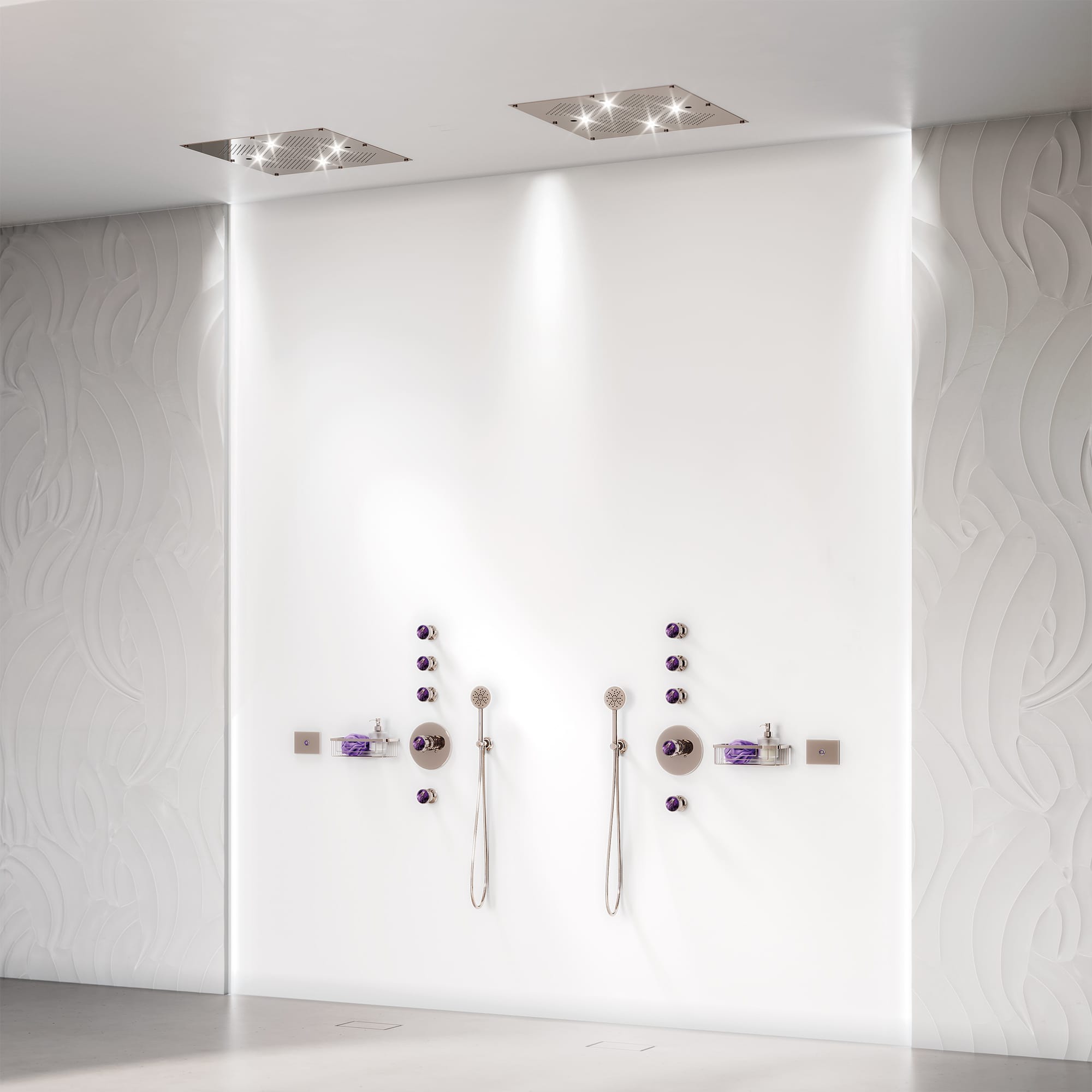 Willkommen im Home Spa! Der luxuriöse Duschbereich für Zwei sorgt mit Kopfbrausen inklusive Regen- und Farbtherapie-Funktion und Unterputz-Thermostat-Brausebatterie in Platin mit violettem Amethyst für sinnliches Erleben und pure Entspannung.