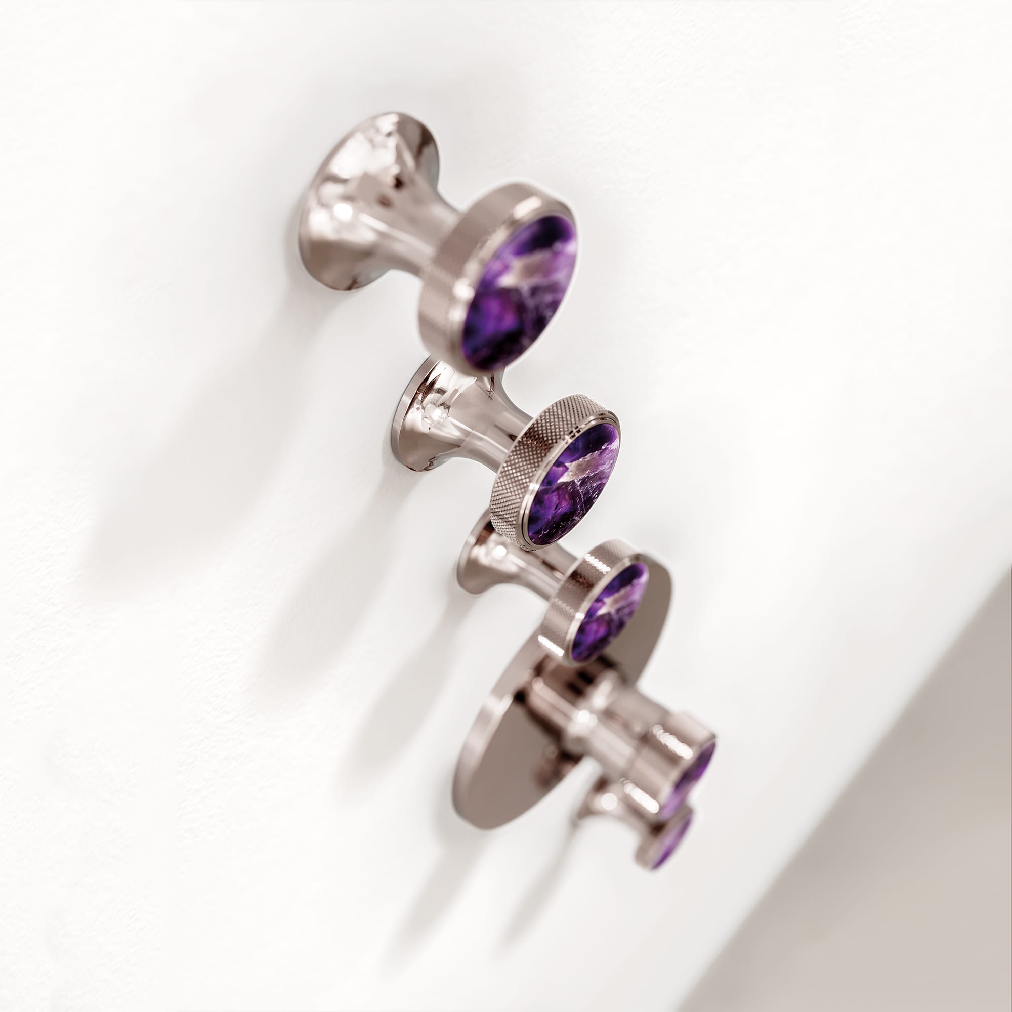 Jörger Design mit Liebe zum Detail: Das „Valencia“-Schmuckstück, der violette Amethyst, ruht eingefasst in einem Korpus aus edlem Metall mit griffig gestaltetem Rändel und harmoniert perfekt mit Farbe und Glanz der kostbaren Platin-Oberfläche.