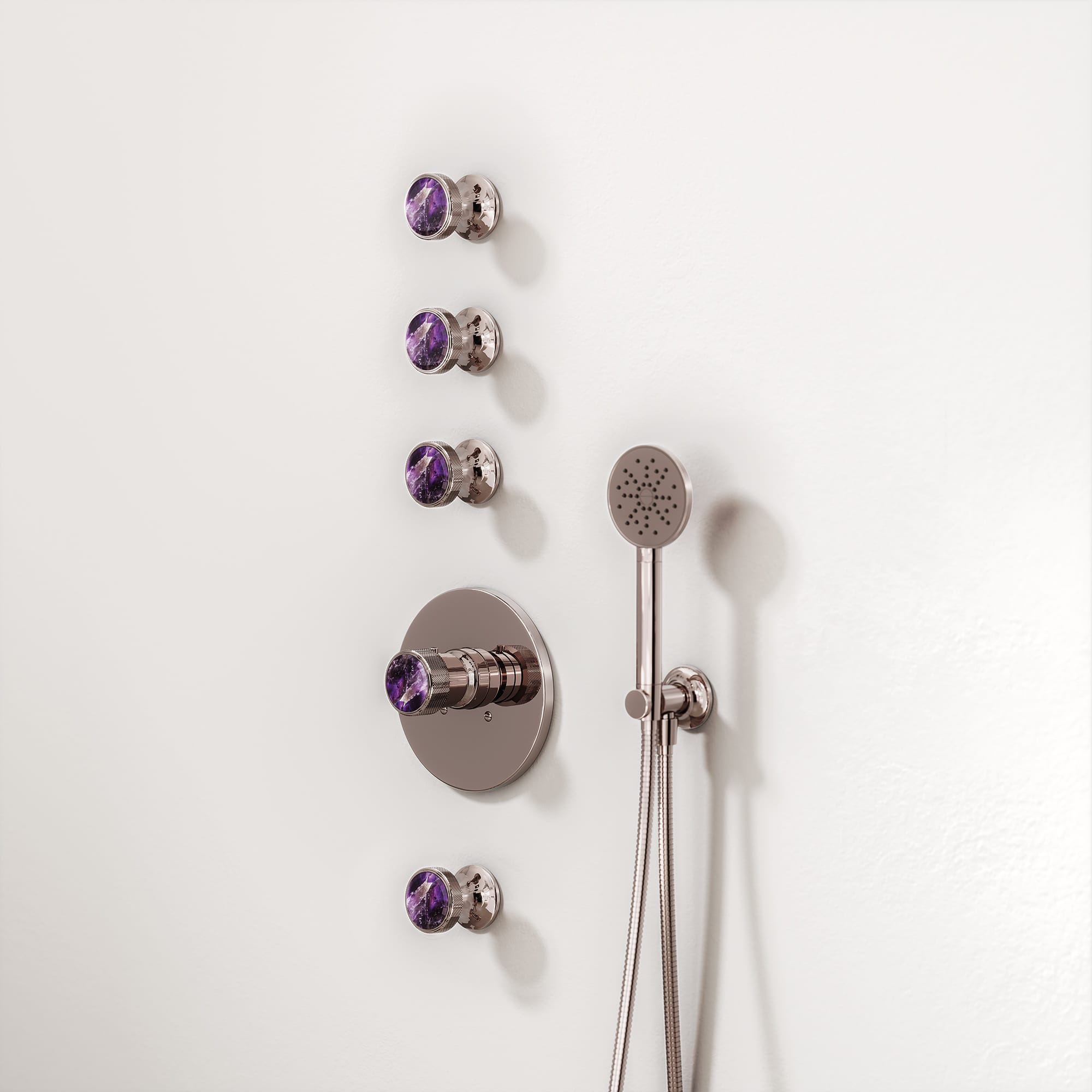 Luxuriöses „Valencia“-Schmuckdesign im Duschbereich mit Unterputz-Lösung der Thermostat-Brausebatterie und vier Ventilen in edel glänzendem Platin. Die kräftig violetten Amethyste ziehen den Blick magisch an und setzen faszinierend schöne Design-Akzente.