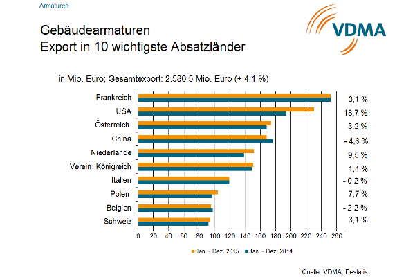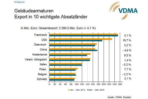 Die deutsche Gebäudearmaturenindustrie schloss das Jahr 2015 mit einem leichten Umsatzplus von 3 % ab. Haupttreiber dieser Entwicklung war dabei die Nachfrage in den Euro-Ländern, die im Vergleich zum Vorjahr um 13 Prozent zulegte.
