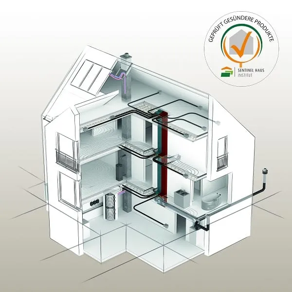 „Sowohl die Schornsteinsysteme mit dem Edelkeramik-Rohr als auch das Lüftungsnetzwerk Via Vento S geben nur minimale Mengen an Substanzen an die Raumluft ab und sind von daher bestens für Gebäude mit hohen Ansprüchen an die Gesundheit geeignet“, sagt Peter Bachmann, Geschäftsführer des Sentinel Haus Instituts.