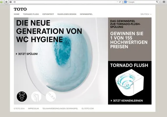 Toto ist vor fünf Jahren mit der WC-Spülung Tornado Flush am Markt. Das soll mit einem Online-Gewinnspiel für Gewerbetreibende gefeiert werden.